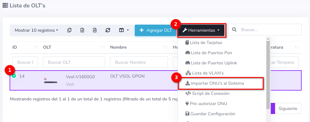 1En la Lista OLT's seleccionamos el equipo con el que trabajaremos para después ir a Importar ONU's al Sistema, que se encuentra en el botón con la leyenda Herramientas.