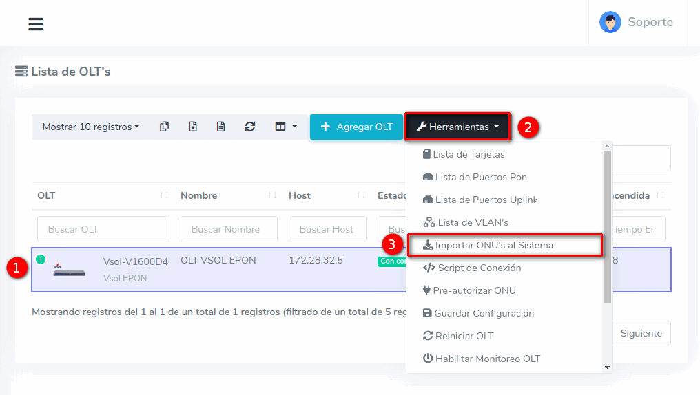 1En la Lista OLT's seleccionamos el equipo con el que trabajaremos para después ir a Importar ONU's al Sistema, que se encuentra en el botón con la leyenda Herramientas.