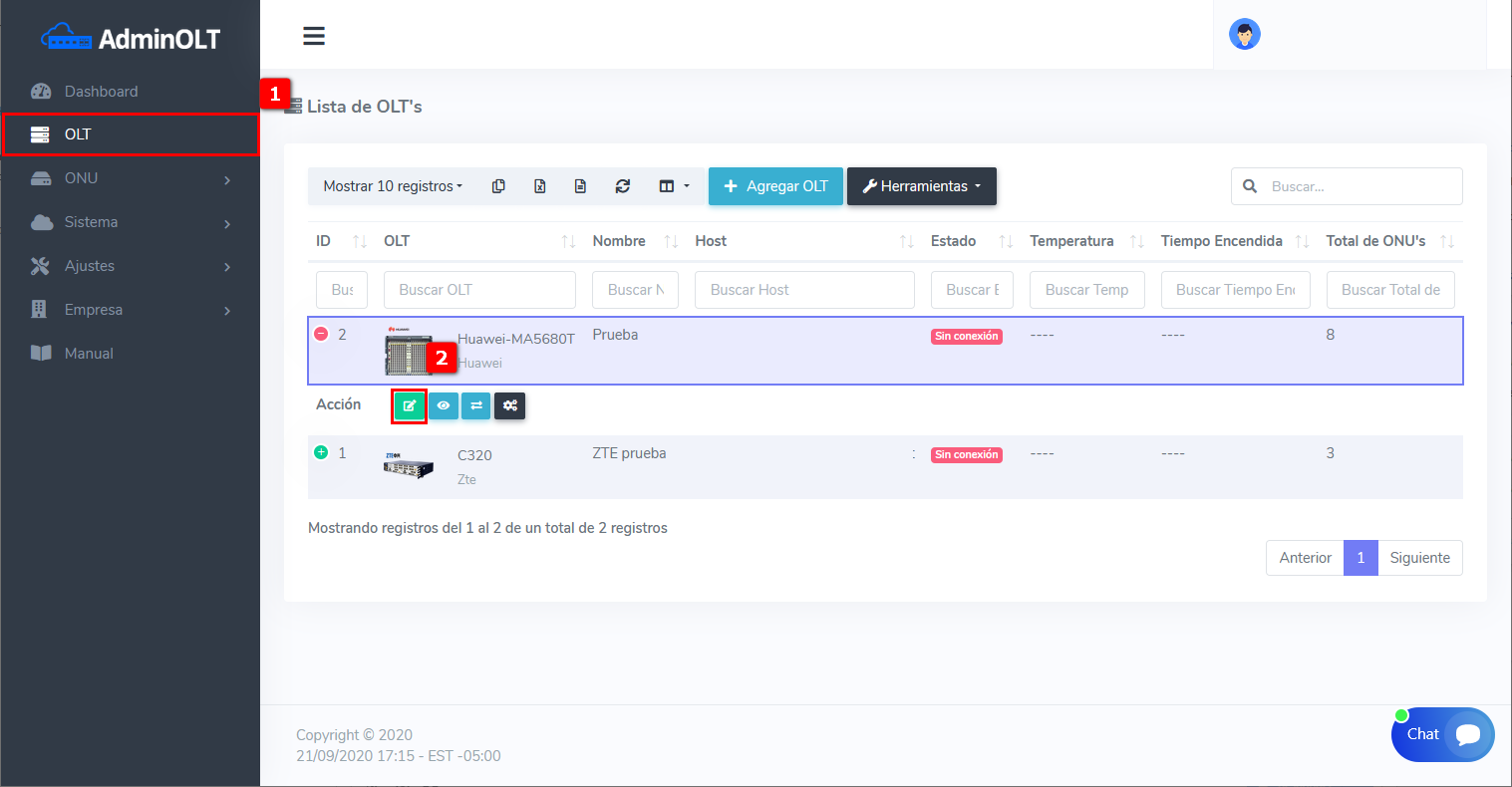 1En lista de OLT seleccionamos el equipo que vamos a conectar y le damos en editar.