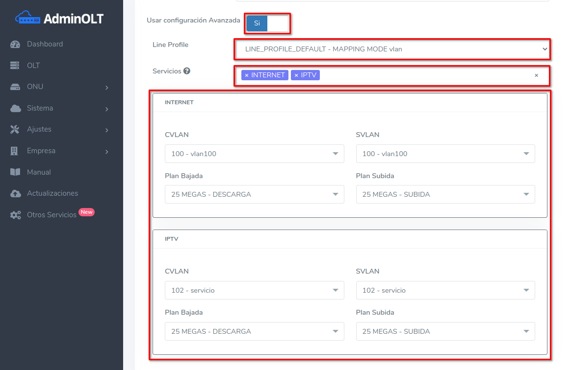 - Servicios: Relacionado con el Line Profile seleccionado, si se selecciona "Crear perfil genérico" podrá escoger entre los diferentes tipos de servicios disponibles (INTERNET, IPTV, VOIP, NMS)