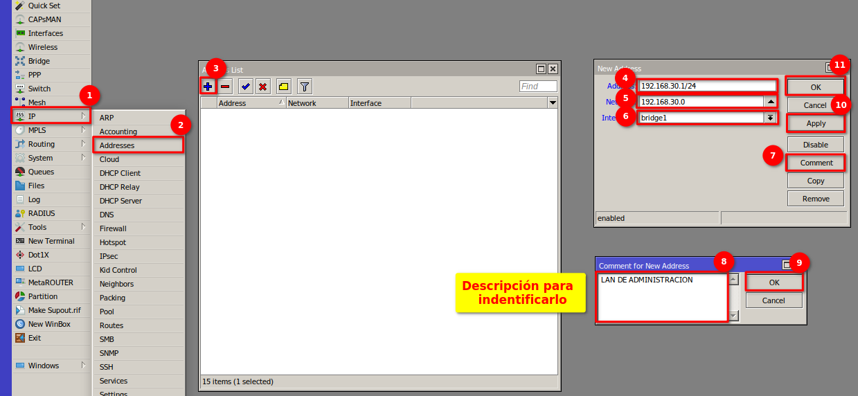 1 Nos dirigimos al apartado de Bridge en el menú de nuestro RouterBoard para generar la interfaz bridge1 y así poder agrupar los puertos que estarán trabajando en la red de la OLT.