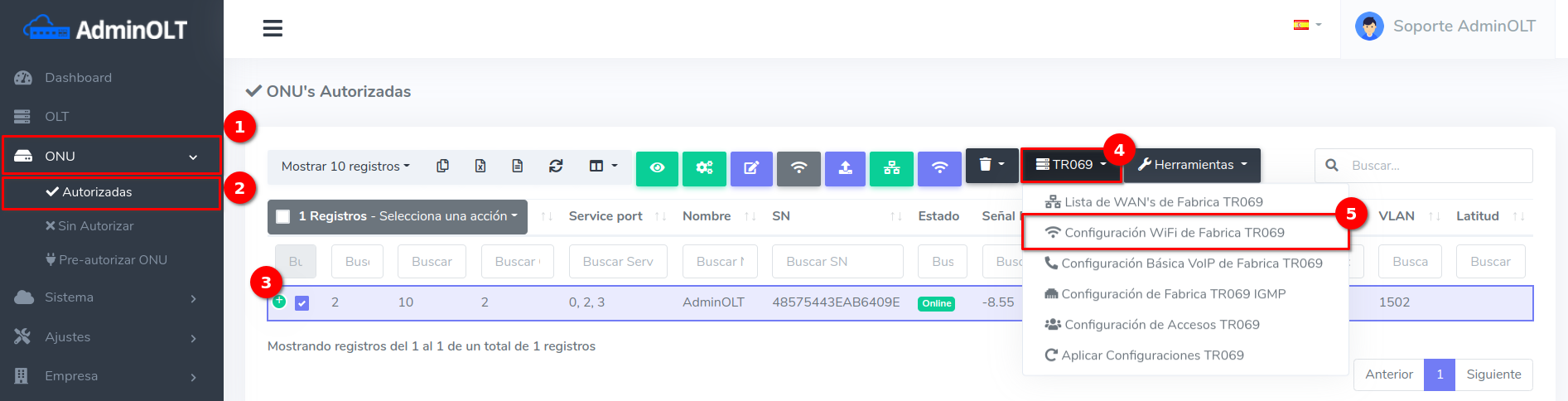 1Para poder agregar una Configuración WIFI, debemos dirigirnos a la sección ONU > Autorizadas. Seleccionamos la ONU con la que vamos a trabajar y damos click en el botón con la leyenda TR069 > Configuración WIFI de Fábrica TR069.