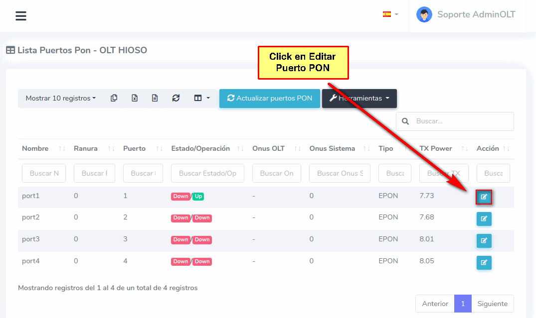 1 Ir a Lista de Puertos PON de nuestra OLT