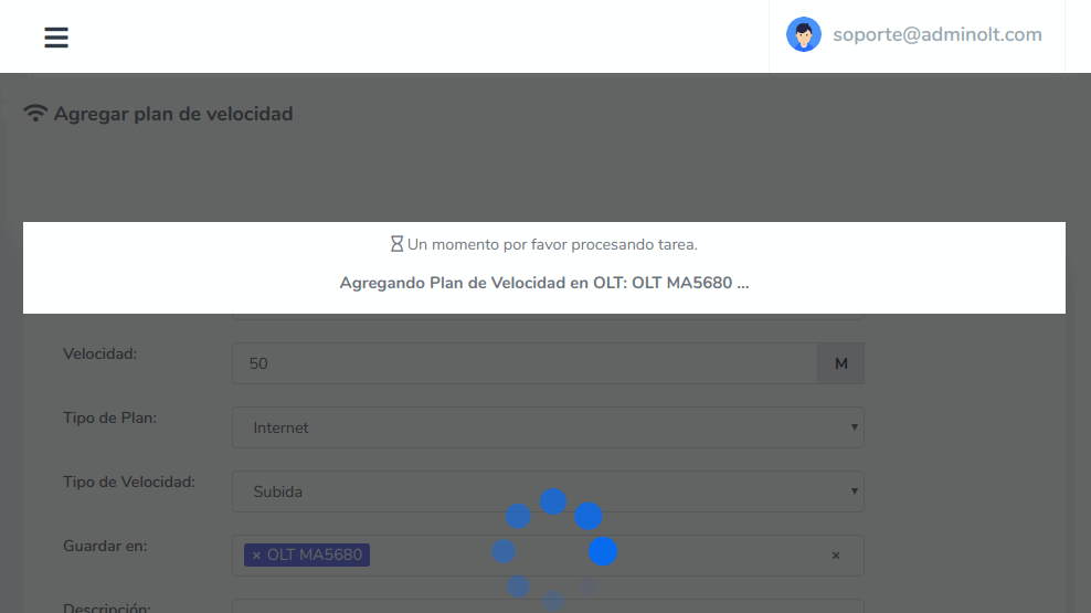 4 Una vez hayamos guardado la información AdminOLT se conectara con la OLT y agregara el Plan de Velocidad