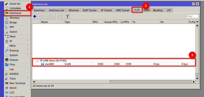 1 Para esto debemos dirigirnos en mikrotik a la sección de Interfaces > VLAN y agregar una VLAN con el puerto 100.
